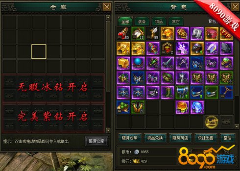 搜索"8090网页游戏"修真人士都有个随身空间供自己使用的,而我们游戏中也是不可或缺的。在8090寒刀中,玩家除了可以使用背包中的道具外,也可随时开启随身仓库,在随身仓库中取出或存入物品道具。随身仓库是寒刀玩家无需专门跑到仓库NPC处,就能直接打开并使用的一种仓库类型。
