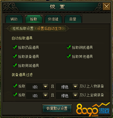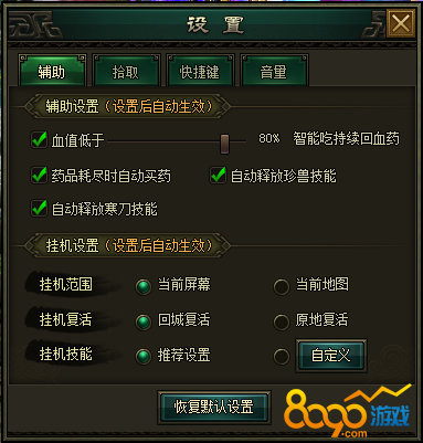 可以设置辅助系统,在PK或打怪时,设置百分比只能持续吃回血回气的药物,复活的方式、挂机的范围,挂机时使用的技能。