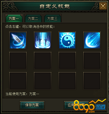 A. 把技能在设置在选框内保存技能,挂机时只会使用方案中的技能。