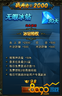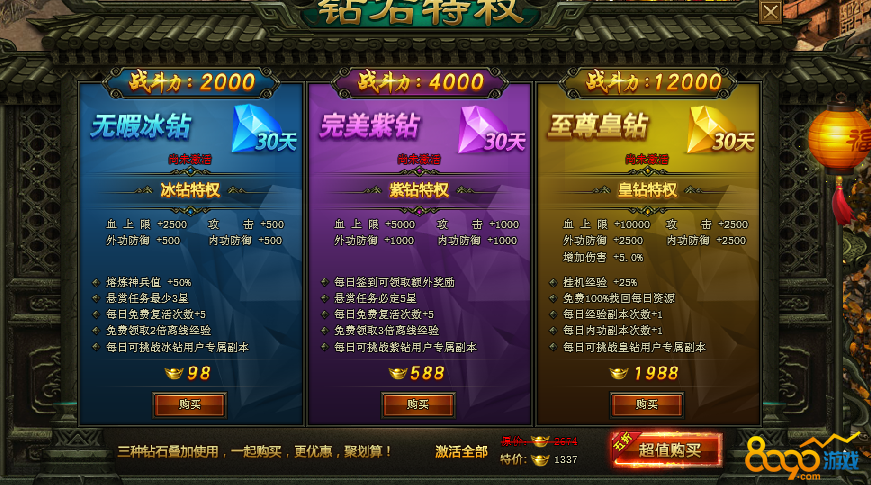 钻石特权分三个钻,分别是无暇冰砖(98元宝激活)、完美紫钻(588元宝激活)、至尊皇钻(1988元宝激活)。三种礼包可以叠加使用,目前三种礼包一起购买只需要1337元宝,清不要错过哦。