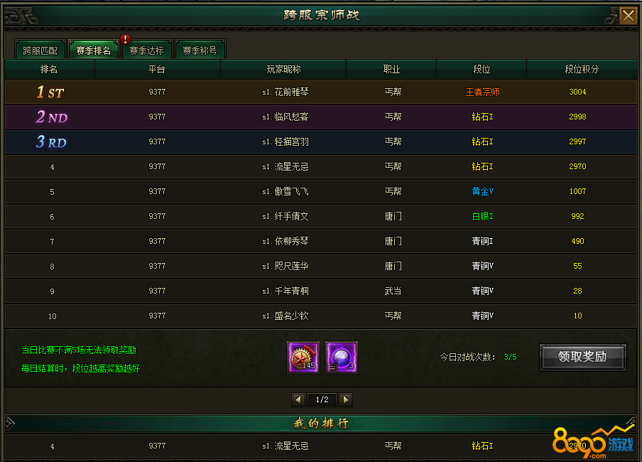 记录本赛季玩家的段位积分排名,玩家还可以在此页面领取每日对战次数奖励。