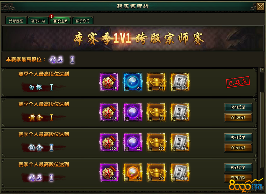 玩家在本赛季段位达到要求后,可领取赛季段位奖励,大量宗师点、灵魄、绑元、银币!