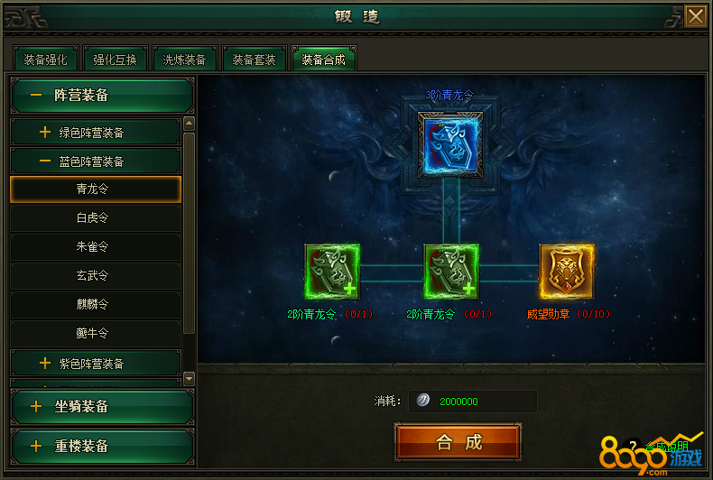 阵营装备合成需求:2个低阶阵营装备+威望勋章+银币;