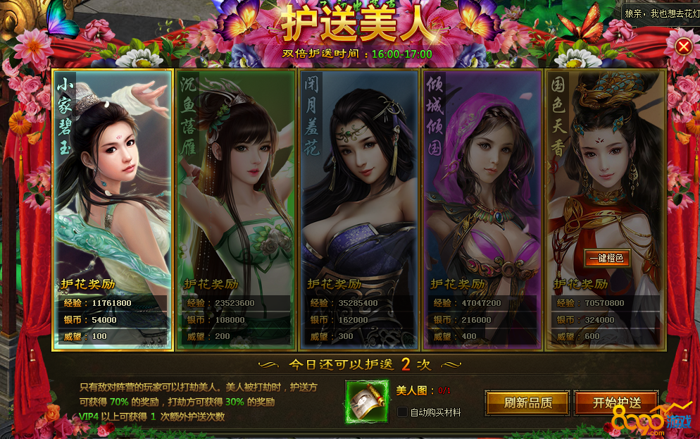 有五个品阶的美人需要护送,接任务时的品阶是小家碧玉,但是玩家可以通过消耗美人图去刷新品质,将有概率提升美人品阶。还能通过消耗元宝,一键橙色。