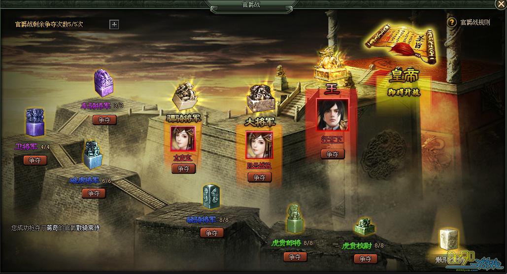 官爵战功能开启后,争夺官爵可获得金钱和休整令。