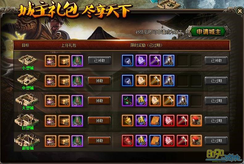 树帜称霸,达成条件:国家等级3级,国家拥有城市数量达到50座,50级以上玩家可领取此荣耀