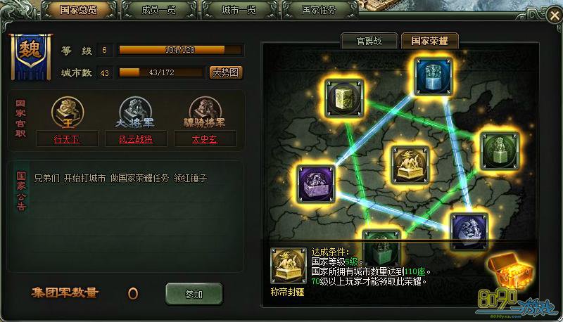 征战天下,达成条件:国家等级4级,国家拥有城市数量达到60座,55级以上玩家可领取此荣耀
