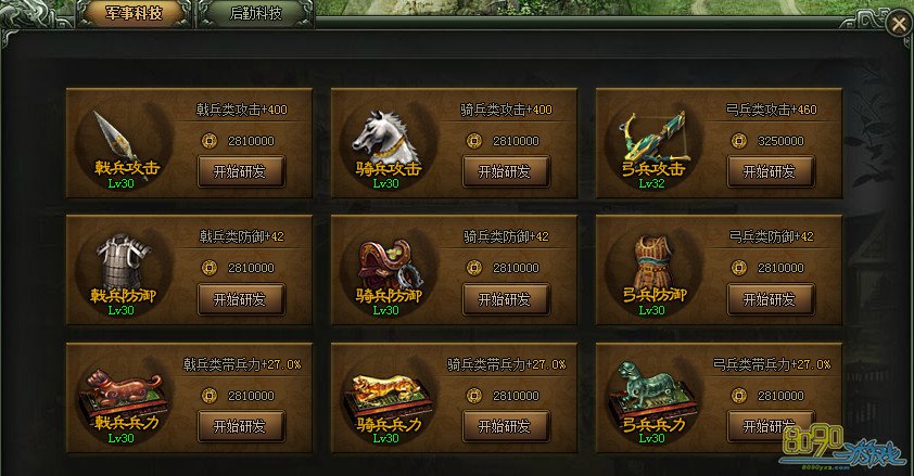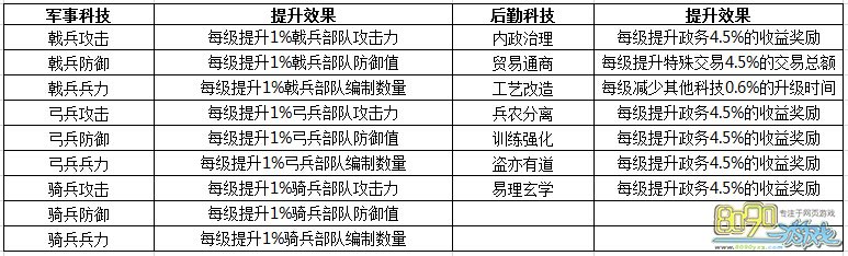 在行营界面中点击“科技”可以打开科技面板。科技系统分为军事科技和后勤科技两类。军事科技主要用于支撑各个兵种的攻防加成。后勤科技主要用于提升游戏中其他玩法所获得的收益值。