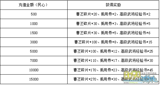 活动内容:玩家在活动期间累计充值达到一定民心,即可在游戏内“精彩活动”面板领取相应奖励。