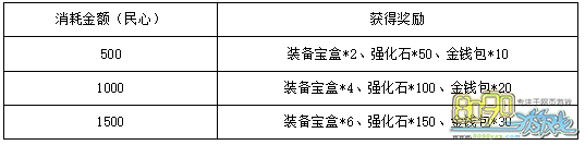 活动内容:玩家在活动期间消耗达到一定民心,即可在游戏内“精彩活动”面板领取相应奖励。