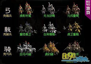 游戏中的兵种分为弓兵、骑兵、戟兵三个大类。弓兵拥有远距离攻击的射程和不错的攻击力,但是防御力薄弱;骑兵拥有强大的攻击力和高速的机动性,但是大多也存在防御薄弱的缺陷;戟兵的攻击较低,但是拥有最强的防御能力。