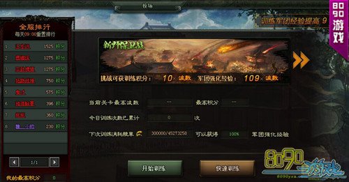 玩家等级达到47级即可开始参加训练,开始训练后,玩家的军团会置身于一个战场城池的主城中,一回合之后,系统的兵力开始源源不断的刷新,并向城市发动进攻,玩家需要进行防守,并坚持足够多的回合,就能获得军团经验,所获得经验会根据校场建筑官员进行经验加成。此外,每日训练前三次可获得100%训练经验,第四次开始每次递减10%。当然,坚持的回合数越多,最终获得的奖励就越多。