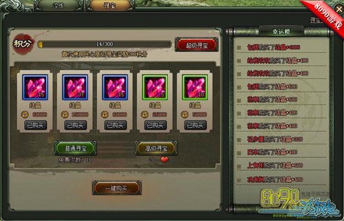 结晶通过寻宝产出,也可以在部分活动玩法中获得。普通寻宝每天拥有10次免费次数,0点重置,每次普通寻宝积分+1;而高级寻宝前20次消耗20民心,之后每次递加5民心,次数无限制。高级寻宝必出一个紫色物品格,寻宝积分+3,满300积分激活超级寻宝,必为橙色物品格及以上。