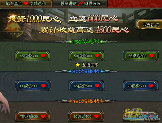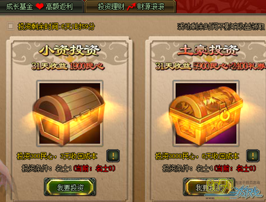 玩法内容:玩家可选取V1(300民心购买)的小资投资和V4(3000民心购买)的土豪投资,分31天返还,玩家每天登陆即可获得,请记得每天登陆哦!