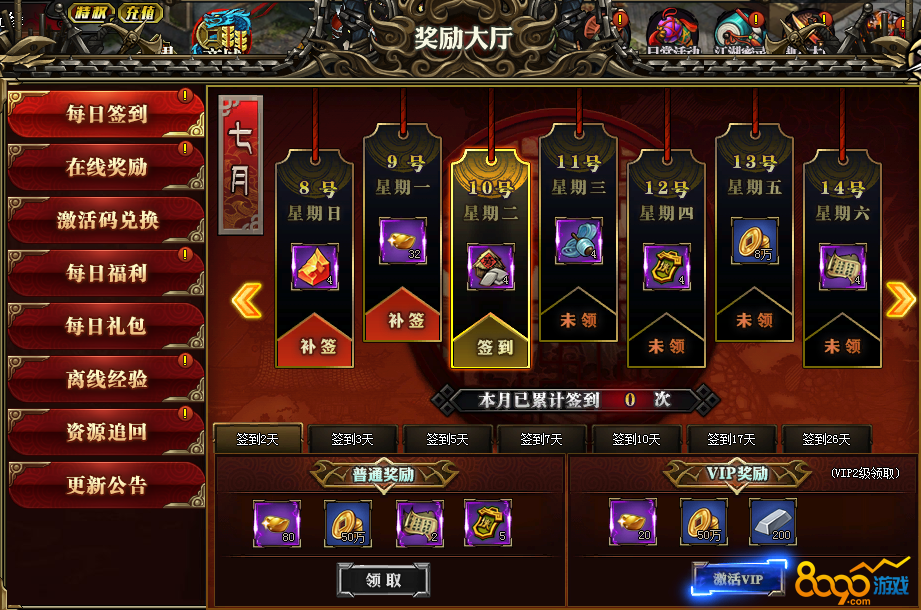活动内容:通过签到,充值,特权,在线,登录等获取丰厚奖励