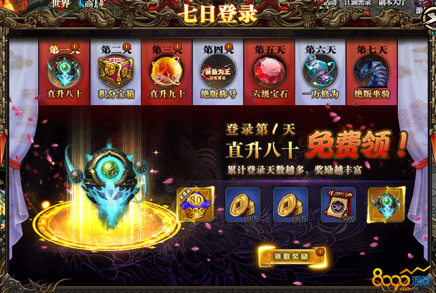 | 签到5天 | 元宝*100 | 铜钱*100万 | 武技残页*4 | 坐骑口粮*10 | 4 | 元宝*30 | 铜钱*100万 | 银两*300 |
