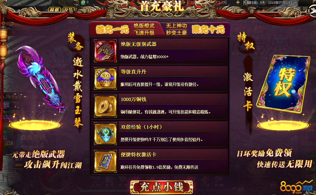 | 便捷特权 | 元宝*50 | 武技残页*3 | 黄品1级礼包*5 | 铜钱*10万 |
