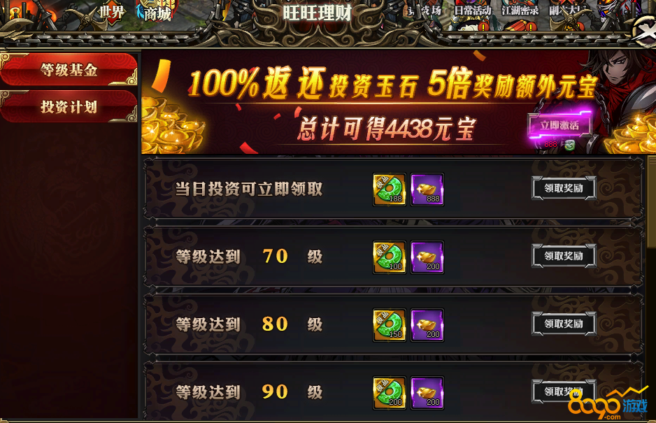 活动规则:等级基金在活动规定时间内进行投资达到等级要求可获取玉石和元宝奖励