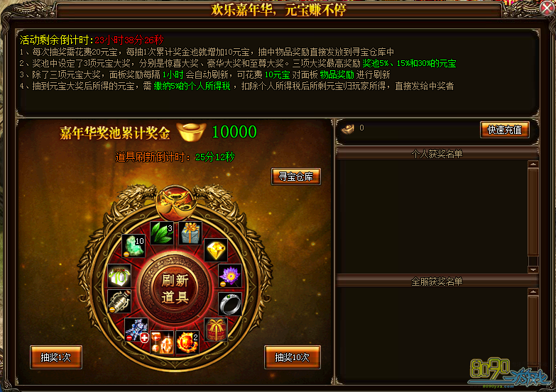 2、转盘面板奖励每隔1小时自动刷新,可花费10元宝对面板奖励快速进行刷新。