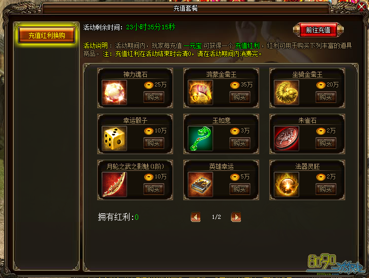 活动详情:活动期间,玩家每充值一元宝可获得一个充值红利,红利可用于购买活动中的丰富道具商品。注意:充值红利在活动结束后清零,请在活动期间内消费完哦。