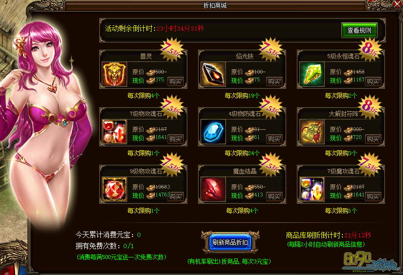 活动详情:活动期间,折扣商城珍宝每2小时刷新一次,低折大放送,最低可1折购买。每天拥有免费刷新折扣次数1次,每消费满500元宝亦可获得一次免费刷新机会,可不断叠加。