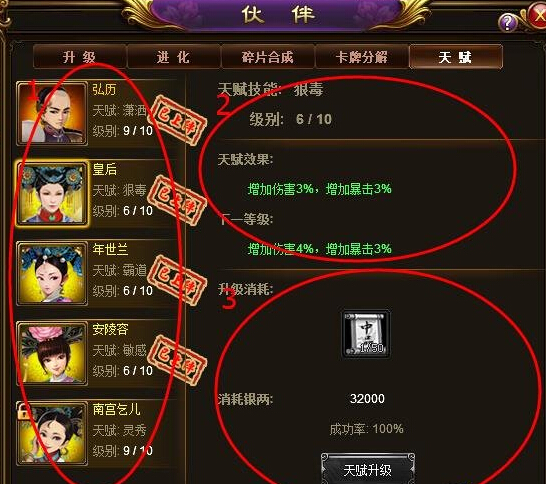 3 天赋升级所需的材料和银两以及成功率,材料和银两足够时点击天赋升级按钮将按成功率判定是否升级成功。