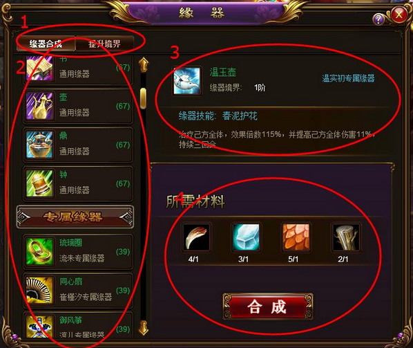 2 显示所有可合成的缘器以及可合成的数量,鼠标停留在缘器图标上时显示缘器的详细信息,点击选中后可在界面右侧合成