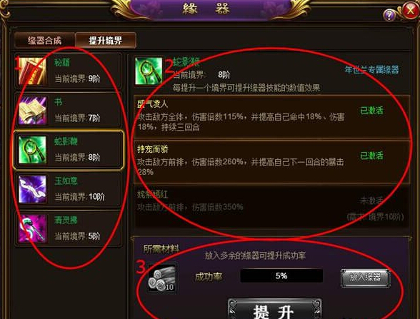 3 缘器提升品阶需要缘木,且品阶越高成功率越低,需要消耗其他缘器提升成功率,缘木数量足够时点击提升按钮,进行境界提升。