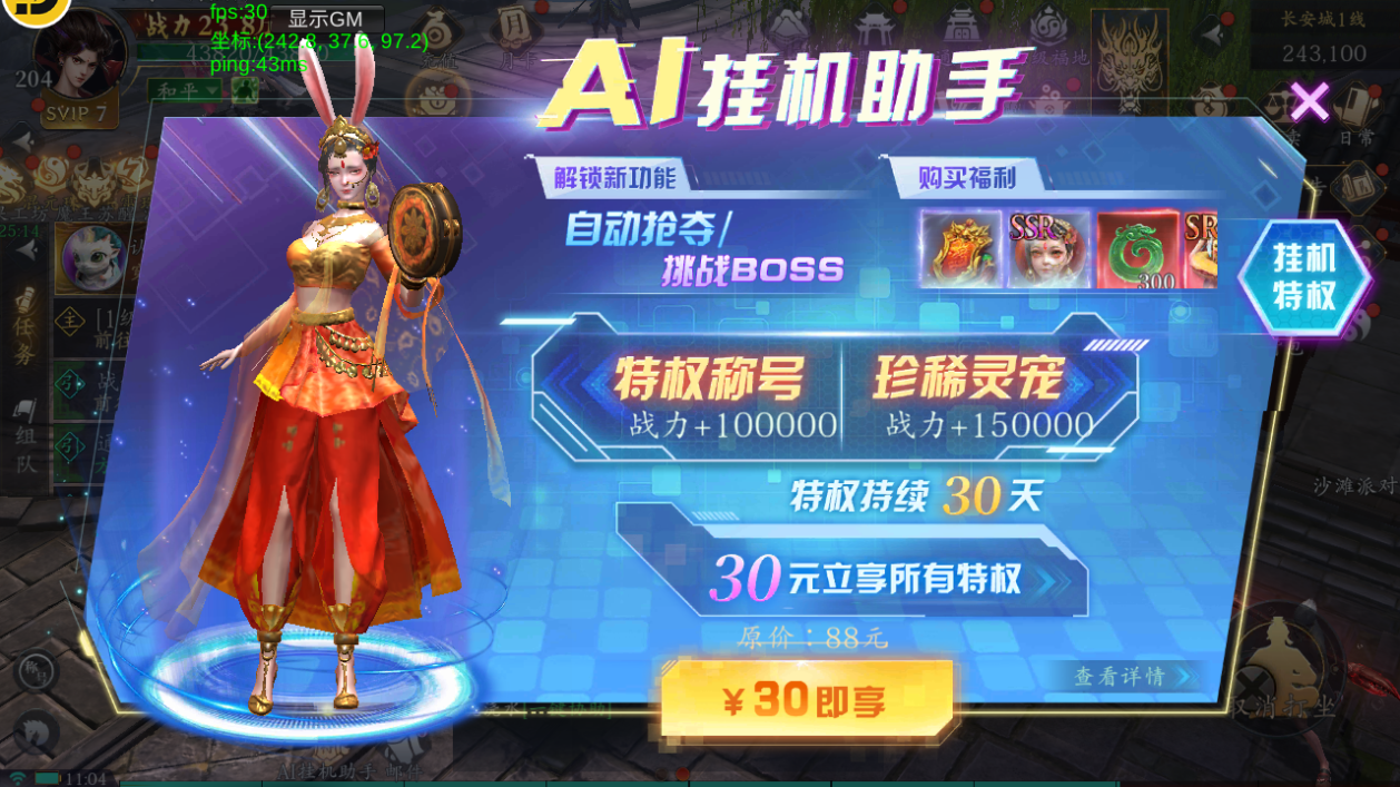AI挂机助手是开服后开启的永久活动,购买AI挂机助手后,系统会自动帮你完成各种日常任务,打败boss,一键解放双手,非常方便哦!