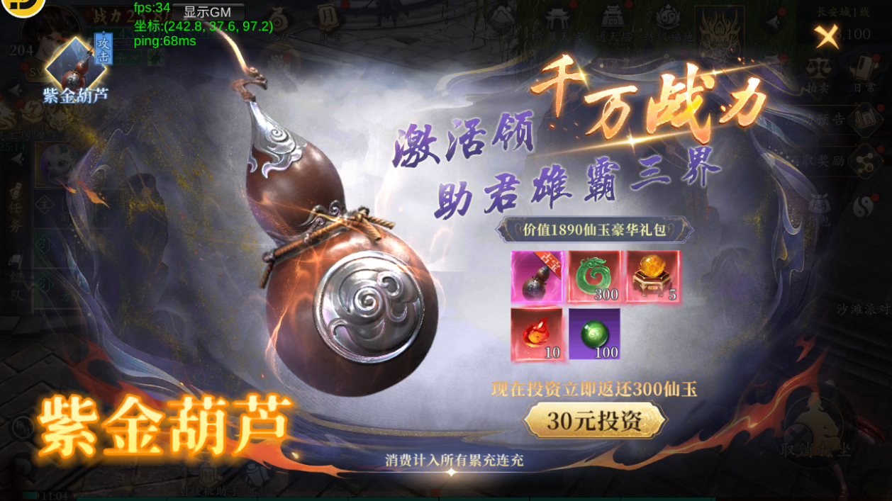 紫金葫芦是开服后开启的永久活动,购买紫金葫芦后可以激活大量属性提升战力,同时随着等级增长,战力还会进一步提升,最高可以提升千万以上的战力,是性价比极高的选择
