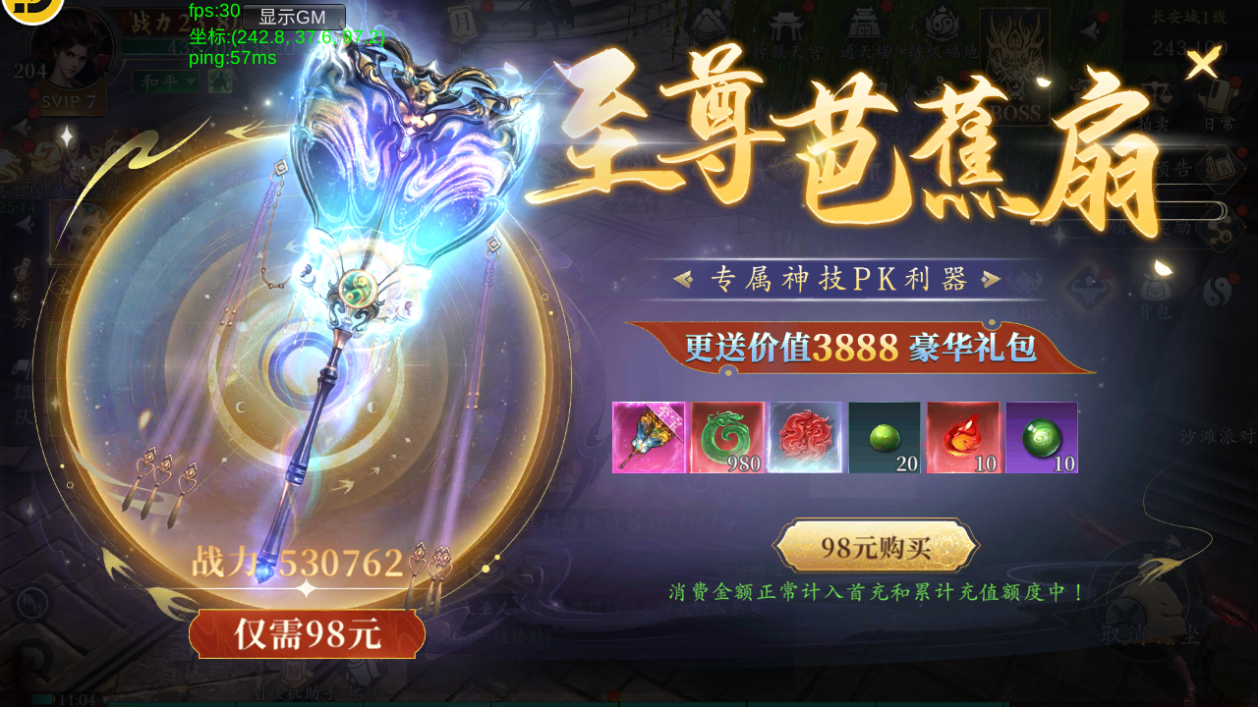 至尊芭蕉扇是开服后开启的永久活动,购买至尊芭蕉扇可以激活强力pvp技能,攻击有概率使对方定身,同时提升大量战力,是您专属的PK利器!
