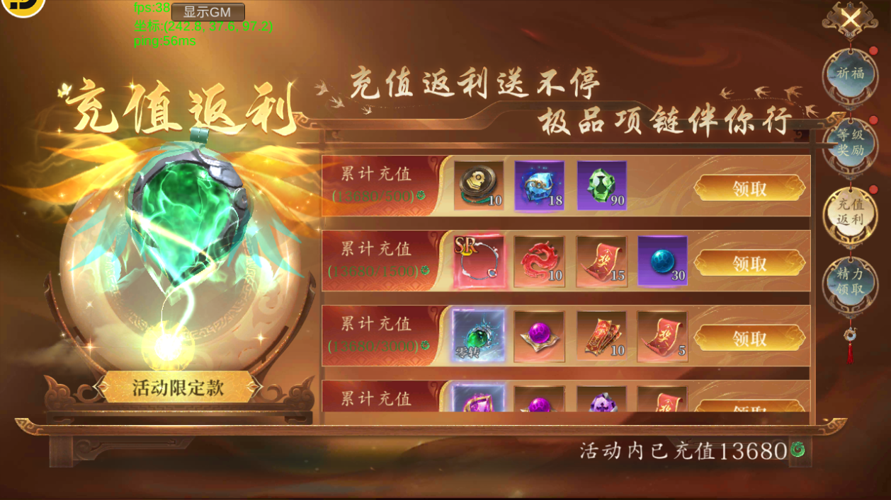 充值返利是开服后开启的永久活动,玩家充值达到一定数额,可以领取对应的奖励,其中包括限定产出的0转项链!