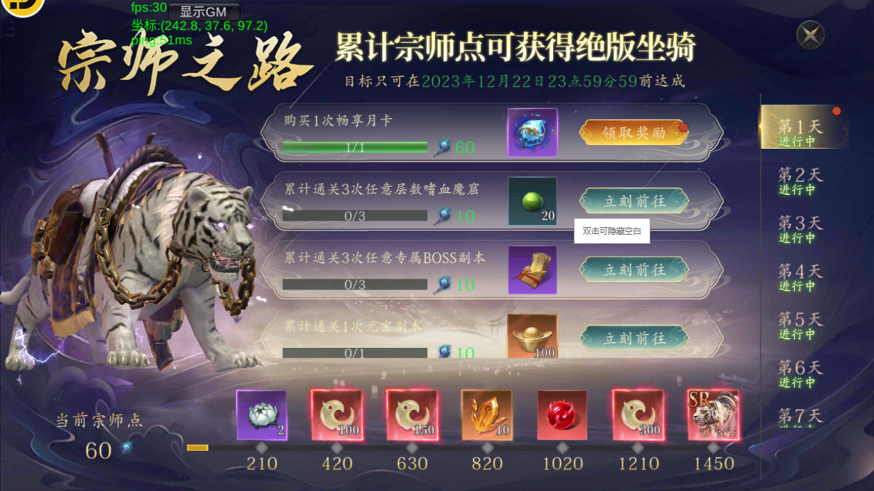 宗师之路是开服后开启的永久活动,开服前7天完成各种指定的任务,累积宗师点,可以领取各式各样的奖励,其中更是包括极品坐骑!
