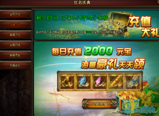 活动期间每日充值2000元宝即可获得丰富奖品道具。