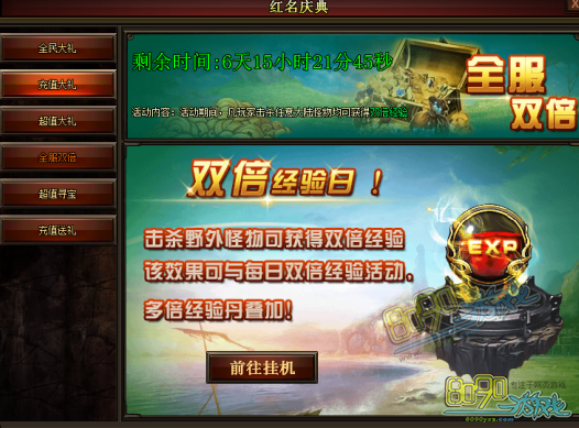 活动期间击杀野外怪物可获得双倍经验