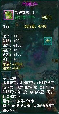 | 5000 | 木楠仙牛、初级钱币符*20、灵宠成长丹*5、内丹保护符*5、初级黑曜石*10、7星打星保护石*1、初级天赋丹*15、紫色灵宠洗髓丹*3、灵宠进阶丹*10 | 高级坐骑,外形炫酷,绝对拉风 |