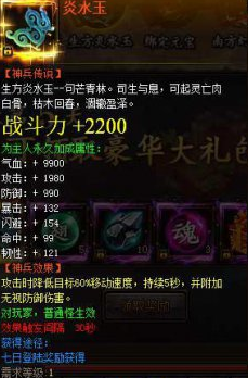 花千骨炎水玉只需要登录5天就可以领取啦,装备后可以增加角色2225点战力,炎水玉的技能效果是在攻击的时候可以降低我们的目标百分之六十的移动速度,持续8秒钟,同时附加无视防御的伤害,触发间隔30秒,对玩家和普通怪物全部有效。