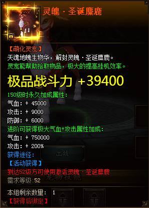 活动奖励: 灵魄·圣诞麋鹿、10阶糖宝装备(血色)、70级金色套装、妖神成长丹、妖神潜能丹、妖神万能丹等