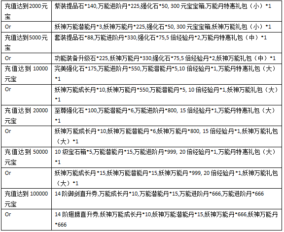 活动内容:活动时间内玩家每天充值达到1000元宝就能领取超值好礼,每天惊喜不断!
