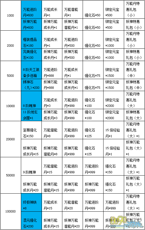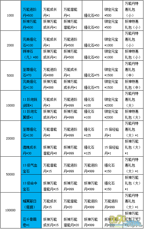 6阶魄神*1、提品石*25、强化石*15、仙品果实礼包*10 、绑定元宝*100、2倍经验丹*1