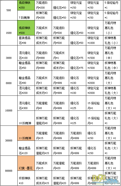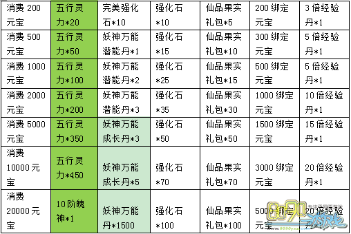 铸神石(凡)*20、木元素*1200、妖神万能成长丹*1、神秘宝石宝箱(大)*1、20倍经验丹*1、绑定元宝*1500