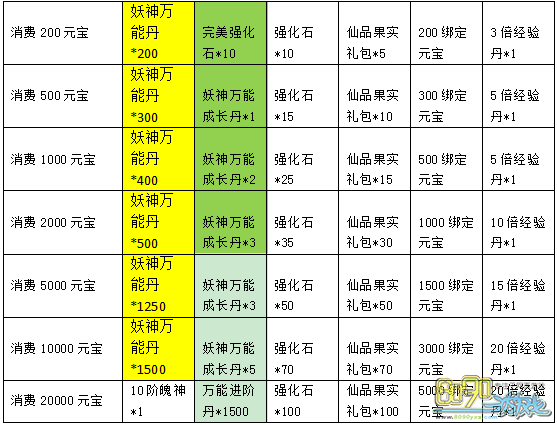 7级宝石箱、提品石*25、强化石*15、仙品果实礼包*10 、绑定元宝*100、2倍经验丹*1