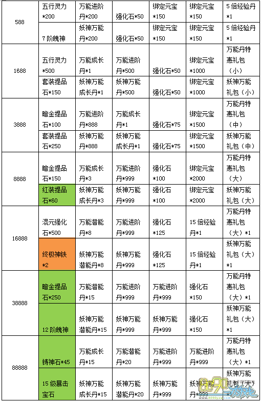 幻工萝卜、低级神铁*50、妖神万能成长丹*1、神秘宝石宝箱(大)*1、20倍经验丹*1、绑定元宝*1500