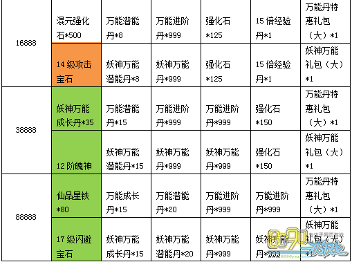 完美霸体升星石、万能进阶丹*800、妖神万能成长丹*1、神秘宝石宝箱(大)*1、20倍经验丹*1、绑定元宝*1500