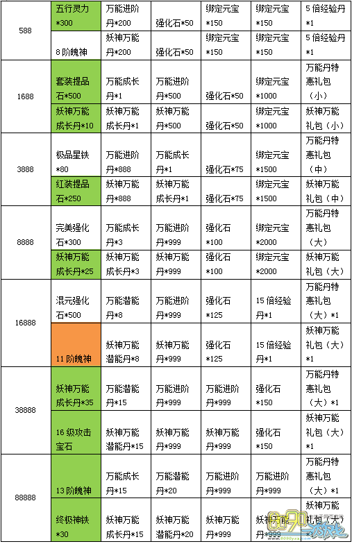 玉米(幻工)、万能进阶丹*1500、妖神万能成长丹*1、神秘宝石宝箱(大)*1、20倍经验丹*1、绑定元宝*1500