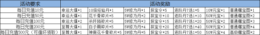 【活动内容】:玩家每日充值到一定金额即取相应档位的丰厚奖励。