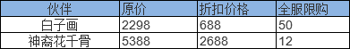 【活动内容】:活动期间玩家可以使用非常优惠的折扣价格抢购强力伙伴“白子画”和“神裔花千骨”!集齐花千骨|杀阡陌|白子画|神裔花千骨,可激活超强神技“众志成城”——玩家濒死时可恢复40%血量