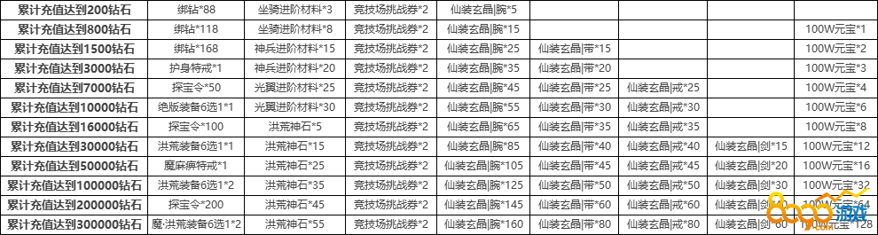 花费388充值钻石:1000W元宝*1、强化石*10、1W修为丹*2、探宝令*2