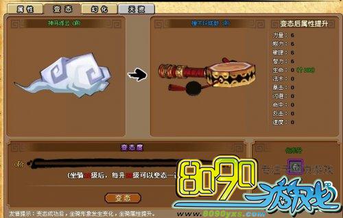 坐骑变态:坐骑变态后不只是属性提升,而且在外观上也有很大的变化。坐骑变态需要满足两个条件,一是坐骑升到10级(以后坐骑每升20级才能变态一次),二是需要足够的化形丹。