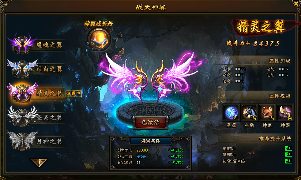 激活神翼有指定的等级、战斗力、通过玩法、在线时间的需求,这些需求贯穿整个游戏。